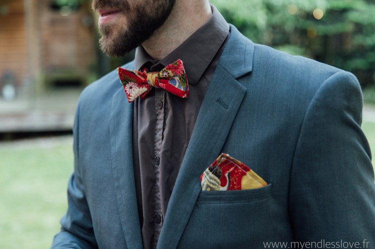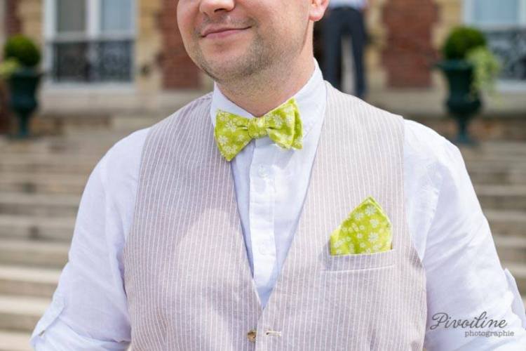 Je vous propose de réaliser des noeuds papillons, cravates et pochettes de costume sur-mesure. Nous choisissons ensemble un tissu et je créé pour Monsieur le futur marié un accessoire qui lui correspondra.